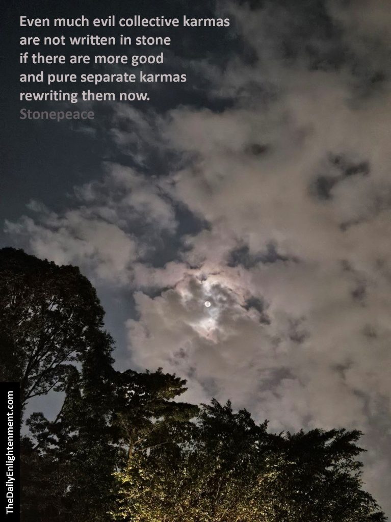 As Stonepeace put it, ‘Even much evil collective karmas are not written in stone if there are more good and pure separate karmas rewriting them now.’