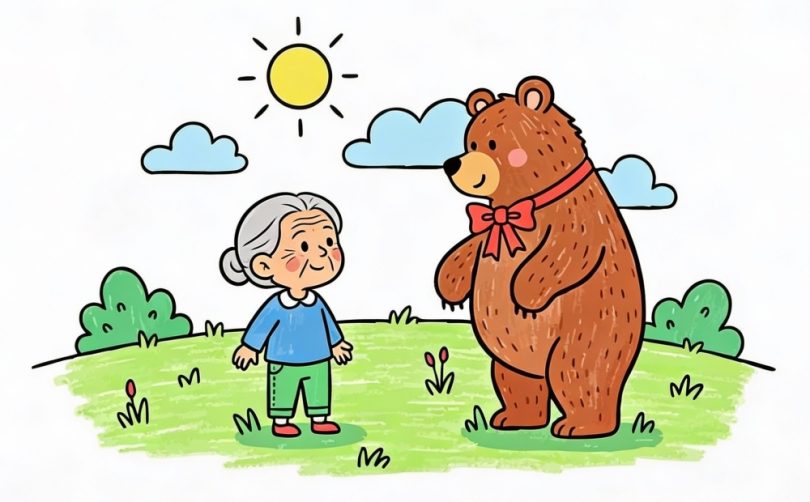 In the past, there was an old mother at a tree below lying down, when a bear desired to come and seize her. At that time, the old mother ran around the tree to avoid it. The bear searched for and chased after her, with one hand hugging the tree, desiring to catch the old mother. As the old mother got anxious, immediately joining to the tree, she pressed firmly on the bear’s two paws, with the bear not getting to move.