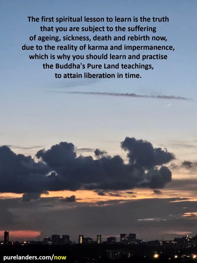 Answer: The first spiritual lesson to learn is the truth that you are subject to the suffering of ageing, sickness, death and rebirth now, due to the reality of karma and impermanence, which is why you should learn and practise the Buddha’s Pure Land teachings, to attain liberation in time.